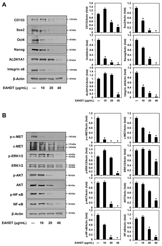 Effect of EAHDT on stemness markers and c-MET-mediated signaling pathway in Huh7-derived LCSCs. (A,B) Huh7 LCSCs were exposed to EAHDT (10, 20, 40 μg/mL) for 48 h. Protein levels were detected by Western blot analysis using specific antibodies and further quantified by densitometry. β-Actin levels were used as a loading control. * p < 0.05 vs. the control.
