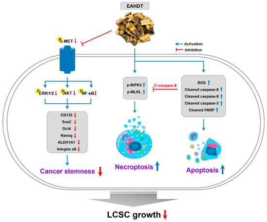 In summary, this is the first study to demonstrate the in vitro and in vivo anti-CSC activity of HDT in HCC. The research assessed the inhibitory effects of ethanol, chloroform, and ethyl acetate extracts of HDT branches on the proliferation of Huh7-derived LCSCs. Additionally, we identified the concentration-dependent necroptotic and apoptotic effects of EAHDT in Huh7 LCSCs, elucidating the underlying molecular mechanisms (Figure 9). Additionally, EAHDT was shown to suppress the stem-like characteristics of Huh7 HCC cells through the downregulation of c-MET signaling and stemness markers. Consequently, these research findings suggest that EAHDT holds significant potential as a pharmaceutical resource for the development of natural medicines aimed at preventing and treating HCC by targeting LCSCs. However, considering that EAHDT contains trace amounts of ampelopsin and quercetin, both well-established active ingredients of HDT, it is important to identify the distinct major active constituents responsible for the anti-CSC activity of EAHDT in HCC. This elucidation is necessary for a comprehensive understanding of its mechanism of action. Moreover, in vivo studies using tumor xenograft mouse models are needed to definitively verify the efficacy and safety of EAHDT for the treatment of HCC.