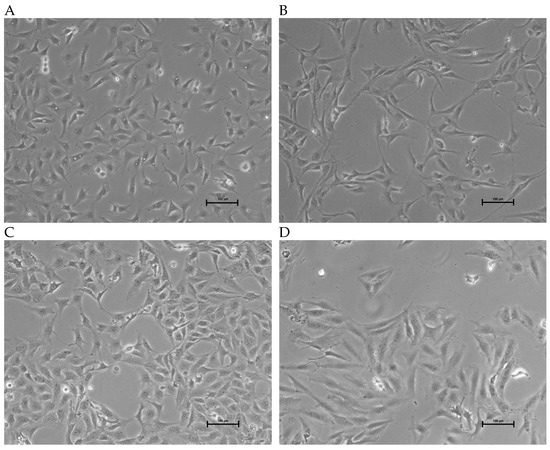 Figure 1. Images of OSA cell lines during culture. Phase contrast images showing growth morphology at 10× magnification. (A) BR cells (passage 47); (B) BZ cells (passage 45); (C) LK cells (passage 35); (D) SAOS2; calibration bar —100 μm.