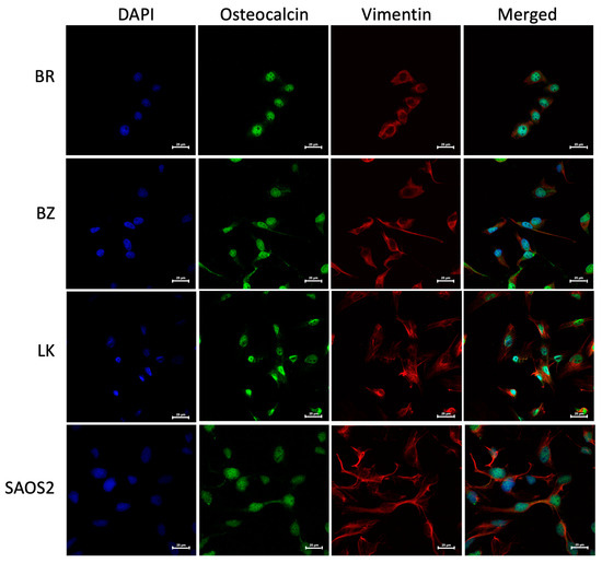 Figure 2. The canine BR, BZ and LK cell lines were confirmed as osteosarcoma by IHC staining. DAPI signal reflects the staining of nuclei in blue, Alexa Fluor® 488 of osteocalcin in green and eF615® of vimentin in red. Images were acquired at 60× magnification with calibration bar —25 μm. The human OSA cell line SAOS2 was used as a positive control. Osteocalcin is a secreted protein and is being produced continuously, sometimes appearing as cytoplasmic, sometimes nuclear and sometimes covering the cell, especially when the cells are small.