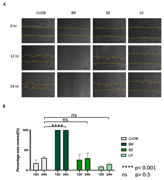 The wound healing assay was used to examine the migration capacity of cells in a monolayer. Briefly, 100,000 cells/well were plated overnight and allowed to reach 70–80% confluence in 6-well plates. Before placing scrapes, cells were incubated with serum-free medium overnight and then treated with mitocycin C (5 µg/mL, Sigma-Aldrich, St. Louis, MO, USA) for one hour. Then, a 1 mL pipette tip was used to scrape the monolayer and generate wounds under aseptic conditions. The cells were then incubated with cell culture medium with 1% FBS. Each wound area was photographed after being made, as well as 12 and 24 h thereafter. The scratch area remaining was calculated by analyzing the images at the online website https://sketchandcalc.com/ accessed on 25 May 2023, which uses Gauss’ shoelace formula [19]. Statistical analysis was completed using two-way ANOVA test via Prism 9.0, GraphPad Software.