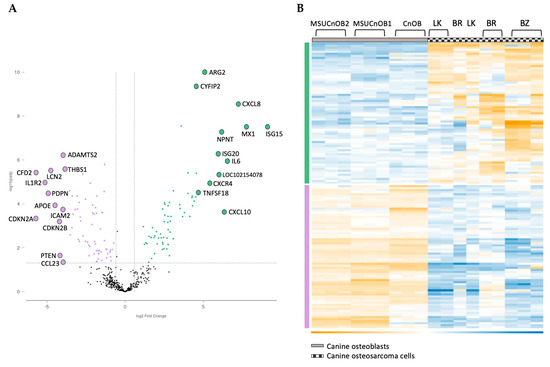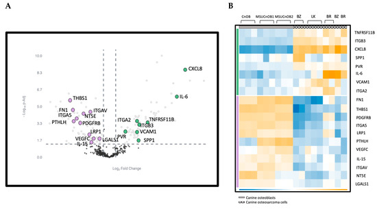 Figure 5. (A) Volcano scatter plot of genes in cancer pathways analyzed by nCounter® Canine IO panel. Dotted vertical lines indicate a 1.5-fold change in normalized gene expression and the dotted horizontal line indicates a p-adjusted value cut-off of 0.05. The upregulated genes are labeled in green and downregulated genes are in purple. (B) Heatmap of genes in the EMT pathway showing differential expression. Genes in the EMT pathway are highlighted in both panels.