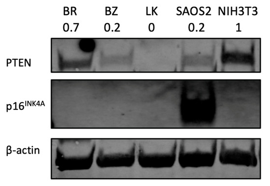 As PTEN and CDKN2A (which codes for p16INK4A) are among the most frequently downregulated or deleted loci in osteosarcomas, the protein expression of both was assessed by Western blot. The human OSA cell line SAOS2 was used as a positive control for p16INK4A and the mouse fibroblast cell line NIH3T3 was used as a positive control for PTEN protein expression. Beta-actin was used to reflect protein load per lane. As shown in Figure 6, two canine OSA cell lines, BZ and LK, showed PTEN loss, whereas BR had lower PTEN expression.