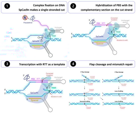 - Nelson, J.W.; Randolph, P.B.; Shen, S.P.; Everette, K.A.; Chen, P.J.; Anzalone, A.V.; An, M.; Newby, G.A.; Chen, J.C.; Hsu, A.; et al. Engineered pegRNAs improve prime editing efficiency. Nat. Biotechnol. 2022, 40, 402–410. [Google Scholar] [CrossRef]