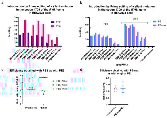 Comparison of the efficiency obtained using the PE2, PE3 and PEmax strategy. The efficiency of various technological variations of the Prime editing technique was tested by inserting a silent mutation in codon 4709 of the RYR1 gene in HEK293T cells. (a) Illustration of the results using the PE2 and the PE3 methods. (b) Illustration of the PE2 and PE3 methods using the PE and the PEmax strategies. (c) The figure illustrates the ratio of the percentage of gene editing obtained with PE3 relative to the percentage obtained with PE2. (d) Illustration of the ratio of PE2max editing relative to PE2, and of PE3max relative to PE3.