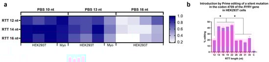 Effect of varying PBS length and RTT on editing efficiency. (a) The darker the box is, the higher is the percentage of editing. This heatmap also summarizes the effects of varying the length of RTT and PBS tested under different conditions (PE2, PE3, PE2max, PE3max) and in different cell types (HEK293T and myoblasts), in order to compare only the effects of RTT length and PBS, i.e., without considering the effect of the strategy used or the cell type used. For each sample, the ratio of its efficiency value to the highest efficiency value obtained in the same experiment under the same condition was calculated. A value of 1 thus indicates that this sample obtained the best editing efficiency in the experiment. In order from left to right, the columns represent the following conditions for 10 nt PBS and 13 nt PBS: HEK293T PE2, HEK293T PE3, HEK293T PE2max and Myoblasts PE3. For 16 nt PBS, the columns are as follows: HEK293T PE2, HEK293T PE3, HEK293T PE2max and HEK293T PE3max. Since epegRNAs with 16 nt PBS were significantly less effective in experiments in HEK293T, these epegRNAs were not tested in myoblasts. (b) Illustration of the results of inserting a silent mutation in codon 4709 of the RYR1 gene in HEK293T cells while testing different RTT lengths. All the epegs used in this experiment had a PBS containing 10 nt. The length of the RTT was varied from 12 to 35 nucleotides. RTT containing 14 to 22 nucleotides produced the best Prime editing results. One-way ANOVA and multiple comparisons were used. * represents a significant difference using a p-value of 0.001.