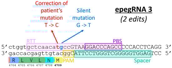 Mbakam et al. [18] demonstrated that the introduction of additional silent mutations in the RTT sequence increased editing efficiency, as it allowed the bypass of the mismatch repair system. Liu’s group also reached the same conclusion [5]. Therefore, new epegRNAs 3C, 3D, 3E and 3G were constructed to test this strategy for the RYR1 gene (Figure 7 and Table 2). We also tested the hypothesis that mutating the first two nucleotides (AA) of the RTT (which are also common to the spacer) (Figure 7) would simulate the effect of a mutation in the PAM. Our hypothesis is, therefore, that these mutations would limit subsequent spacer attachment, an effect that may be mainly observable after multiple treatments. Introducing mutations into the RTT sequence that are also common to the spacer sequence (the first three nucleotides of the RTT) may also increase prime editing efficiency as it could reduce the misfolded epegRNA interactions [19].