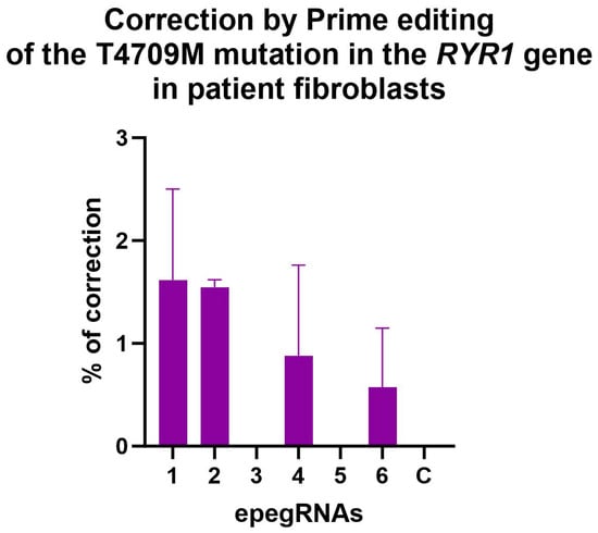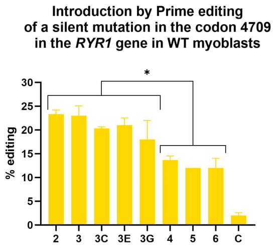 Insertion by Prime editing in wild-type myoblasts of a silent mutation adjacent to the eventual patient’s mutation in the codon 4709 of the RYR1 gene. A one-way ANOVA indicated that the editing values obtained with epegRNAs 2, 3, 3C, 3E and 3G were significantly different from the editing values obtained with epegRNAs 4, 5 and 6. This test also demonstrated that all epegRNAs produced editing values significantly different from the negative control (named C). An ANOVA test was performed, and * represents a significant difference with a p-value of 0.05. The 3D epegRNA is not shown in this graph, as it did not insert the same silent mutation adjacent to the patient’s mutation.
