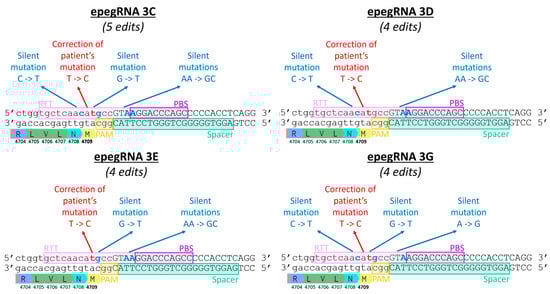 Sequences and characteristics of epegRNAs 3, 3C. 3D, 3E and 3G. The nucleotide C in red is to correct the patient mutation T4709M, and the nucleotide T in green is to insert a traceable silent mutation. Additional silent mutations in blue are included in epegRNAs 3C, 3D, 3E and 3G.
