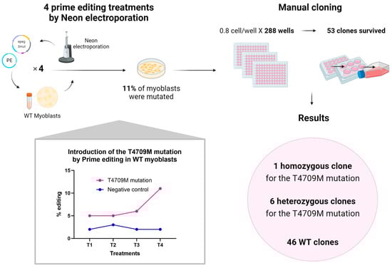 Generation of a cell line homozygous for the RYR1 T4709M mutation by prime editing on WT myoblasts. Four Neon electroporation treatments were performed on immortalized normal myoblasts to deliver the PE components (plasmids coding for PE and an epegRNA). The PE2 strategy was used here to minimize off-targets in the eventual cell line. After these four treatments, the percentage of introduction of the patient’s mutation (T4709M) reached about 11%. Manual cloning was then performed. 0.8 cells were deposited per well in 288 wells of 96-well plates. Only 53 clones survived and multiplied. Of these 53 clones, one turned out to be homozygous for the T4709M mutation, six clones turned out to be heterozygous for this mutation, and 46 clones were WT.