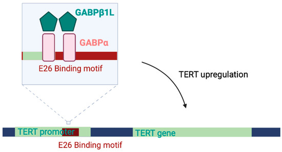 The β1S can dimerize with GABPα, and both β1L and β2 have a leucine-zipper domain that mediates the tetramerization of two GABPαβ heterodimers. Among ETS transcription factors, GABP is the only one able to bind neighboring native ETS motifs and mutant ETS motifs as a heterotetrametric complex [21]. The GABP tetramer-forming isoforms are critical in activating the mutant TERT promoter; for this reason, these are under evaluation as potential therapeutic targets (Figure 2).