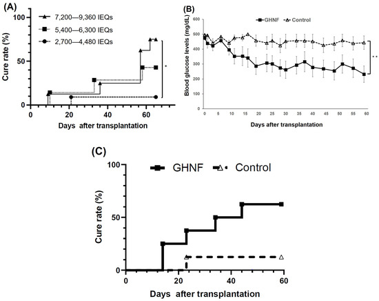The outcomes of islet engraftment after subcutaneous islet transplantation under several conditions. (A) The cure rate after transplantation of different numbers of islets in the GHNF group. The cure rate of the recipients’ dose-dependently increased (2,700–4,680 IEQs [filled circle, n = 11]; 9.1%, 5,400–6,300 IEQs [filled square, n = 7]; 42%, 7,200–9,360 IEQs [filled triangle, n = 8]; 75%). The outcomes of islet engraftment after marginal islet mass transplantation (5,400 IEQs). (B) The change of the blood glucose levels after islet transplantation. GHNF (filled square, n = 8) group showed significantly better glucose changes than the control group (open triangle, n = 8) (**, p < 0.01). (C) The cure rate after islet transplantation in each group. The cure rate at 60 days after islet transplantation in the GHNF group (62.5%) was significantly higher than that in the control group (12.5%) (*; p < 0.05).