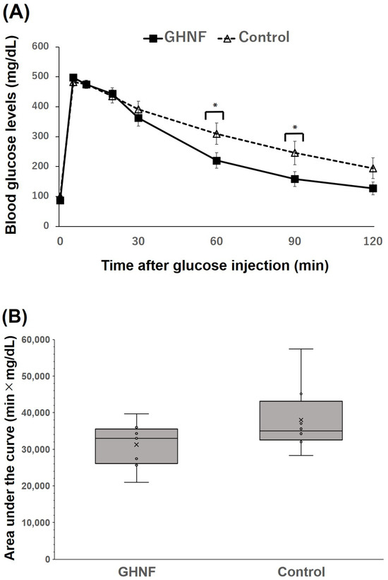 Although the blood glucose changes in the IVGTT did not differ between the two groups (p = 0.16) as a whole, there were significant differences at 60 and 90 min after glucose injection (p < 0.05) (Figure 3A). Although the difference was not statistically significant, the AUC in the GHNF group was lower than that in the control group (GHNF: 31,257 ± 2,159 vs. control: 38,994 ± 3,252, p = 0.11) (Figure 3B).