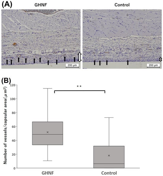 Immunohistochemical analyses of von Willebrand factor (vWF)-positive vessels. (A) Photomicrographs of vWF staining before islet transplantation. The vWF-positive vessels (black arrows) in the capsule around the GHNF were counted. Magnification: ×100. Calibration bars: 200 µm. (B) The number of vessels divided by the capsular area in each group. The number of vWF-positive vessels of the GHNF group was significantly higher than that of the control group (**, p < 0.01). Black arrow: vWF-positive vessels, white arrow: capsules.