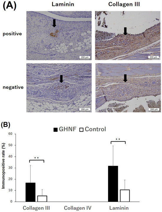 Immunohistochemical analyses of the extracellular matrix (ECM). (A) Representative photomicrographs of laminin and collagen III staining. Black arrows represent the transplanted islets. “Positive” for laminin, collagen III, and collagen IV indicates that distinct immunopositivity was detectable in the fibrous capsule around the islets. “Negative” indicates that immunopositivity was undetectable. Magnification: ×200. Calibration bars: 200 µm. (B) The rates of laminin and collagen III positivity in the GHNF (black box) and control (white box) groups. The positivity of collagen III and laminin in the GHNF group was significantly higher than that in the control group (**, p < 0.01).