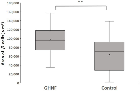 The average area of β cells in each group. The average area of β cells in the GHNF group was significantly larger than that in the control group (GHNF: 97,486 ± 4,214 vs. control: 64,022 ± 4,954 μm2, respectively, ** p < 0.01).