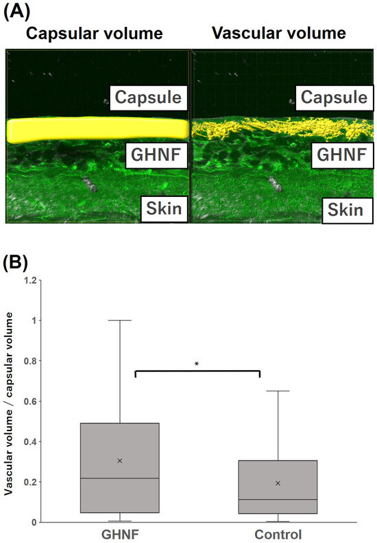 Quantification of the vascular volume analyzed using lectin angiography in the capsule at the transplant site of the GHNF and control groups. (A) Image of lectin angiography in the GHNF group. The volume of the capsules (left) and constructed vessels (right) (shown as a yellow structure). (B) The vascular density in each group. The results represent the vascular volume (μm3)/capsular volume (μm3) and the density of the vessels in the GHNF group was significantly higher than that in the control group (*, p < 0.05).