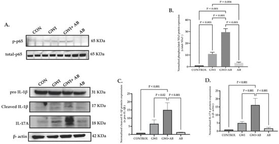 To study the effect of prolonged antibiotic exposure in mice induced with GWI and its association with renal inflammation, we investigated the protein expression of NF-κB activation markers and pro-inflammatory cytokines such as IL-1β and IL-17A. The results indicated that the kidneys of GWI mice that were exposed to a prolonged antibiotic regime (GWI+AB) led to persistent NF-κB signaling activation marked by increased p65 phosphorylation (phosphorylated p65 expression normalized against Total-p65) when compared to GWI mice (Figure 1A,B, p < 0.001 between the GWI+ AB and GWI group). Mice treated with antibiotics only (AB) exhibited a marginal increase in p65 phosphorylation, although this increase was not statistically significant when compared to the control group (CONTROL). Additionally, when examining downstream targets of NF-κB signaling, we observed a notable significant increased protein expression of IL-1β (cleaved IL-1β expression against pro-IL-1β) and IL-17A (IL-17A expression normalized against β-actin) in the GWI+AB group compared to GWI mice (Figure 1A,C,D; for IL-1β- p = 0.02 and for IL-17A- p = 0.001 between the GWI+ AB and GWI group), suggesting that the exposure to antibiotics for a prolonged period might not be effective in mitigating the inflammatory response associated with GWI but plays a role in exacerbating renal inflammation.