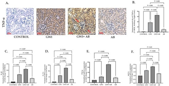 Immunohistochemical analysis and mRNA expression levels demonstrated that prolonged antibiotic administration (neomycin and enrofloxacin) in GWI mice led to an increase in the production of pro-inflammatory cytokines. Representative immunohistochemistry images (A) depict immunoreactivity of TNF-α in kidney sections from CONTROL, GWI (persistent Gulf War Illness), GWI+AB (persistent Gulf War Illness with prolonged antibiotics exposure), and AB mice (prolonged antibiotics exposure only) (n = 6/group). Images were captured at a 40× magnification (scale bar = 50 µm). Immunoreactivity was denoted by the presence of red arrows and morphometric analysis was calculated as %ROI. (B) The bar graph represents the morphometric analysis of TNF-α in CONTROL, GWI, GWI+AB, and AB mice. The data are presented as the mean ± SD (SD: standard deviation) of %ROI (mean value calculated from five different fields in each sample). Bar graphs (C–F) illustrate the normalized mRNA expression levels of different pro-inflammatory cytokines, namely IL-1 β (C), IL-17A (D), and TNF-α (E), and chemokines, specifically MCP-1 (F) against GAPDH. These expression levels are presented as fold changes relative to the CONTROL derived from kidney tissue samples of CONTROL, GWI, GWI+AB, and AB mice. The experiment was performed in triplicates and the data are represented as mean ± SEM (SEM: standard error mean). Statistical significance was determined using one-way ANOVA with the Bonferroni–Dunn post hoc test. p < 0.05 was considered statistically significant.