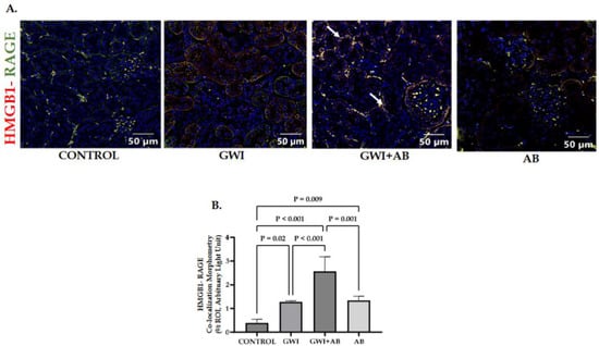 HMGB1 is a widely conserved nuclear protein that plays a pivotal role in numerous biological processes and is renowned for its ability to initiate immune responses as a damage-associated molecular pattern (DAMP) when found in the extracellular milieu. Previous research from our lab has documented elevated circulating levels of HMGB1, which have been associated with the development of gastrointestinal and neuro-inflammation in both sub-acute and persistent mouse models of GWI [31,32]. Increased concentrations of HMGB1 have been observed in both serum and urine among individuals with renal diseases. Various renal cell types such as podocytes, mesangial cells, tubular cells, endothelial cells, and lymphocytes express HMGB1; however, during injury, the primary source of HMGB1 expression is the renal tubular epithelial cells and podocytes [33]. HMGB1 triggers the release of pro-inflammatory cytokines and chemokines by interacting with TLRs and RAGE [30]. Following this rationale, we hypothesized the involvement of HMGB1-mediated RAGE activation led to the inflammatory phenotype in the kidneys. An immunofluorescence staining technique was performed to label kidney sections for studying the co-localization of the HMGB1 (red)/RAGE (green) interaction. We observed that the co-localization events (observed in yellow color) in the proximal convoluted tubular region of the kidneys (marked by white arrows) were significantly increased in the GWI+ AB group compared to the GWI group and control (Figure 3A,B; p < 0.001 between the GWI+ AB and GWI or control group). The GWI and AB group also showed a significant increase in co-localization events as compared to the control, but not to the extent of the GWI+ AB group (Figure 3A,B, p = 0.02 between the GWI and control; p = 0.009 between the AB and control group) indicating a potential role of HMGB1-mediated RAGE activation in the development of renal inflammation.