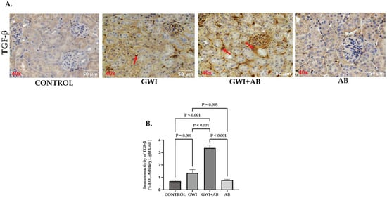 Immunohistochemical analysis demonstrated that prolonged antibiotic administration in GWI mice led to an increase in renal TGF-β production. Representative immunohistochemistry images (A) depict immunoreactivity of TGF-β in kidney sections from CONTROL, GWI (persistent Gulf War Illness), GWI+AB (persistent Gulf War Illness with prolonged antibiotics exposure), and AB mice (prolonged antibiotics exposure only) (n = 6/group). Images were captured at a 40× magnification (scale bar = 50 µm). Immunoreactivity was denoted by the presence of red arrows and morphometric analysis was calculated as %ROI. (B) The bar graph represents a morphometric analysis of TGF-β in CONTROL, GWI, GWI+AB, and AB mice. The data are presented as the mean ± SD (SD: standard deviation) of %ROI (mean value calculated from five different fields in each sample). Statistical significance was determined using one-way ANOVA with the Bonferroni–Dunn post hoc test. p < 0.05 was considered statistically significant.