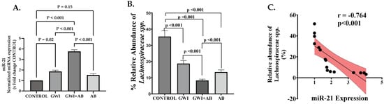 One of the extensively studied miRNAs due to its role in various processes such as apoptosis, fibrosis, and cell proliferation is miR-21. The expression of miR-21 is upregulated in various kidney diseases such as renal fibrosis, CKD, acute kidney injury, and renal cancer. In healthy kidneys, miR-21 is predominantly found in the cortex, where its expression is maintained below a threshold with limited functionality. However, in the event of kidney injury, miR-21 expression increases, becoming prominent in the region of tubular epithelium within the kidneys. This pattern suggests that miR-21 primarily regulates genes located in the tubular epithelium when tissue damage occurs [38]. Additionally, TGF-β is reported to regulate the expression of several miRNAs including miR-21 upregulation, suggesting its role in TGF-β induced renal fibrosis through TGF-β/Smad3 signaling [39]. To investigate the potential relationship between increased TGF-β production and miR-21 expression due to the use of prolonged antibiotics in GWI mice, we investigated the expression profile of miR-21 in kidney tissues by qRT-PCR. We found that the expression of miR-21 was significantly increased in the kidney tissues of GWI+ AB mice compared to the GWI, control, or AB group (Figure 5A, p < 0.001 between GWI+ AB and GWI, control, or AB group). A significant but subtle increased miR-21 expression was also observed in the kidneys of the GWI group compared to the control group (Figure 5A, p = 0.02 between GWI and control). To find an association of gut dysbiosis in species abundance with miR-21 levels in the kidney tissue, we conducted a detailed microbiome analysis of our existing database from the same groups. Results showed that out of the 16 species that had differential abundance in the GWI+ AB group, only Lachnospiraceae had a significant negative correlation with miR-21 suggesting that a low abundance of Lachnospiraceae species caused by prolonged antibiotic administration has a statistically significant correlation with increased levels of miR-21 (Figure 5B,C, p < 0.001; r = −0.764). These results suggest that prolonged antibiotic exposure aggravates GW chemical exposure-induced miR-21 upregulation, a signature miRNA for renal fibrosis that may be associated with increased TGF-β production in the kidney microenvironment along with decreased relative abundance of Lachnospiraceae spp. observed in GWI+ AB mice.
