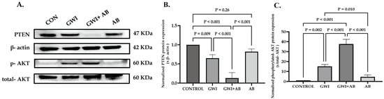 To explore this mechanism, we assessed the protein expression of PTEN in kidney tissues of control, GWI, GWI+ AB, and AB mice by Western blotting. Figure 6A. shows the representative immunoblots of PTEN, β-actin, phosphorylated AKT, and total-AKT in the kidney tissues of control, GWI, GWI+ AB, and AB mice. We observed that the protein expression of PTEN decreased significantly in the GWI+ AB group compared to the GWI, control, and AB group, indicating that increased miR-21 expression in the renal tissue of GWI+ AB mice interferes with PTEN gene expression through post-transcriptional repression of its mRNA. Kidneys of GWI mice also showed a marginal decreased expression of PTEN compared to the control and AB group (Figure 6A,B, p = 0.009 between GWI and control group). However, expression of PTEN was significantly higher in the GWI group than in the GWI+ AB group, suggesting a potential association between prolonged antibiotic exposure and increased TGF-β-induced miR-21 expression, leading to the downregulation of PTEN in renal tissues (Figure 6A,B, p < 0.001 between the GWI+ AB and GWI group). Further, to validate whether TGF-β-induced miR-21 expression results in AKT signaling activation via PTEN, we studied the phosphorylation status of AKT protein at the serine-473 position. Our results showed that activation of AKT signaling was significantly increased in the renal tissue of GWI mice compared to control or AB mice (Figure 6A,C, p = 0.002 between GWI and control; non-significant (ns) between the GWI and AB group). However, a significantly increased AKT phosphorylation at the Ser-473 position, indicating intense activation of AKT signaling, was observed in the renal tissue of GWI+ AB mice than in GWI mice (Figure 6A,C, p < 0.001 between the GWI+AB and GWI group). These results suggested that the use of antibiotics for long periods exacerbated kidney inflammation and fibrosis-like pathology by further increasing activation of AKT signaling through miR-21-induced PTEN downregulation.