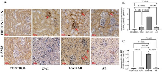 Prolonged antibiotic treatment in GWI mice triggers the activation of AKT signaling, resulting in increased extracellular matrix deposition (ECM) and the induction of epithelial–mesenchymal transition (EMT)-like phenotype. Representative immunohistochemistry images (A) depict immunoreactivity of Fibronectin and α-SMA in kidney sections from CONTROL, GWI (persistent Gulf War Illness), GWI+AB (persistent Gulf War Illness with prolonged antibiotics exposure), and AB mice (prolonged antibiotics exposure only) (n = 6/group). Images were captured at a 40× magnification (scale bar = 50 µm). Immunoreactivity was denoted by the presence of red arrows and morphometric analysis was calculated as %ROI. (B,C) represents a bar graph illustrating the morphometric analysis of Fibronectin (Figure 6B) and α-SMA (Figure. 6C) in CONTROL, GWI, GWI+AB, and AB mice. The data are presented as the mean ± SD (SD: standard deviation) of %ROI (mean value calculated from five different fields in each sample). Statistical significance was determined using one-way ANOVA with the Bonferroni–Dunn post hoc test. p < 0.05 was considered statistically significant.
