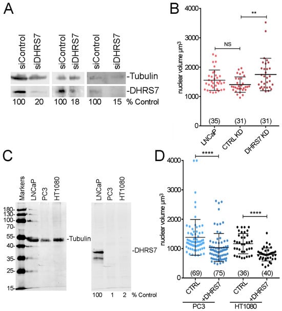 DHRS7 can direct nuclear size changes in prostate cancer cells. (A) Protein levels of DHRS7 by Western before and after siRNA knockdown in LNCaP cells from 3 biological replicates. The % of DHRS7 signal compared to the siRNA control after tubulin normalization is given under the lanes. (B) Whisker-scatterplot chart showing quantification of volume reconstructions for LNCaP cells knocked down for DHRS7 shows its loss resulted in increased nuclear size. (C) Western blot as in Figure 1 showing also levels in HT1080 cells. (D) Whisker-scatterplot chart showing the quantification of volume reconstructions for PC3 and HT1080 cells with or without exogeneous DHRS7 expression as indicated. Exogenous expression of DHRS7 in late-stage PCa PC3 cells yields decreased nuclear size. For (B,D) the number of cells analyzed is shown in parentheses at the bottom. All statistical analyses were performed with unpaired t-test with Welch’s correction: ** p < 0.01, **** p < 0.0001.