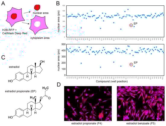 Medium-throughput screen for compounds decreasing nuclear size in PC3 cells. (A) Screening approach. Drug-treated PC3 cells stably expressing H2B-RFP to determine nuclear size were stained after fixation with CellMask Deep Red dye to determine the total cell area. (B) Replicate screens of plate 6 from the Microsource Spectrum library (compounds listed on Table S1, concentration: 10 μM). Nuclear size (vertical axis) was averaged over a total of 350–4000 cells per well (horizontal axis). A1/A12, B1/B12 … G1/G12: DMSO controls. Estradiol propionate (EP) is indicated (red circles). Nuclear size reduction by at least 20% was statistically significant (p < 0.001, Wilcoxson rank test). (C) Molecular structures of estradiol (top) and EP (bottom). (D) Characteristic images of EP (left) and estradiol benzoate (right)-treated cells (blue: H2B-RFP nuclear signal; red: CellMask Deep Red cytosolic signal).