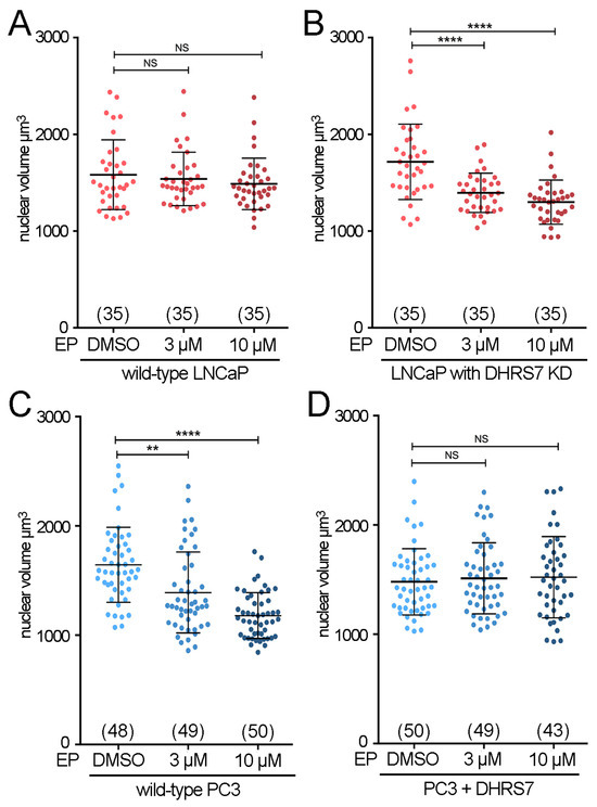 We tested for chemical–genetic interactions by measuring the nuclear size changes in EP-treated PC3 and LNCaP cells +/− targeting DHRS7 levels. EP, both at 3 μM and 10 μM concentrations, had no effect on nuclear volume in DHRS7-positive (wild type) LNCaP cells (Figure 4A). However, when DHRS7 was knocked down, the LNCaP cells became sensitive to EP nuclear size effects in a dose-dependent manner (Figure 4B). This quantitatively mirrored EP-driven nuclear size reduction in wild-type, naturally DHRS7-reduced PC3 cells (Figure 4C). Hence, low DHRS7 is sufficient to elicit EP-driven reduction in nuclear size in two PCa cell lines. Strikingly, DHRS7 loss may also be necessary since restoration of DHRS7 expression in PC3 cells abrogated the nuclear size effects of EP (Figure 4D). The change in nuclear size was ~20–30% for both DHRS7 loss and EP treatment, suggesting that both regulate nuclear size via common pathways.