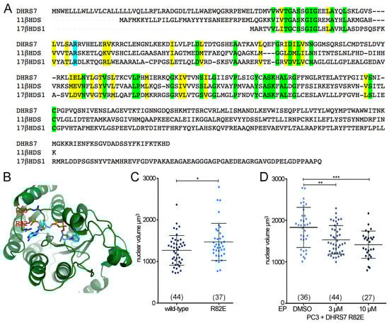 DHRS7 dehydrogenase activity is likely required for its effects on nuclear size. (A) Sequence alignment of DHRS7 against 11β-HDS-B1 and 17-β-HDS-1. The mutated arginine (R82 in DHRS7) is highlighted in blue while residues conserved are in green and conservation of amino acid functionality is indicated in yellow. (B) Structural prediction for DHRS7 generated in April 2017 with the Phyre2 web server, www.sbg.bio.ic.ac.uk/phyre2/, using human 11β-HDS-B1—PDB 2ILT 1BHS. (C,D) Whisker-scatterplot charts showing the quantification of nuclear volume in PC3 cells expressing DHRS7 wild-type or R82E mutant alone (C) or in presence of the indicated concentrations of estradiol propionate (EP) (D). For (C,D) the number of cells analyzed is shown in parentheses at the bottom of the graph for each condition. All statistical analyses were performed using unpaired t-test with Welch’s correction: * p < 0.05, ** p < 0.01, *** p < 0.001.