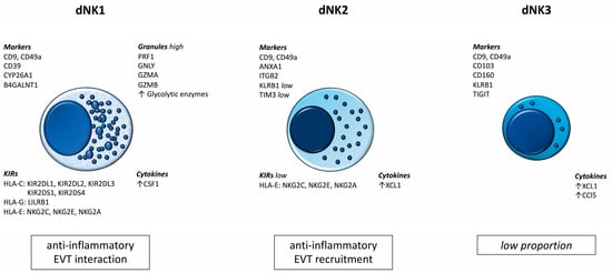 The results of recent studies prove the existence of subpopulations of dNK cells. These populations differ not only in their numbers and surface marker profiles, but also in their biological roles. Figure 1 summarizes the most important information currently available regarding dNK cells [36].