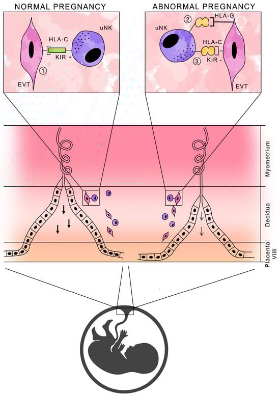 NK cells in normal pregnancy are not cytotoxic, and their function is to produce cytokines and growth factors that promote pregnancy development. It is the activation, rather than the inhibition, of uNK cell activity that is essential for normal pregnancy, due to the secretion of substances necessary for placental development [37,38]. Figure 2 shows a schematic presentation of HLA antigens with the participation of KIR receptors in normal and abnormal pregnancies.