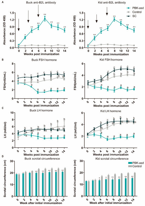 The data obtained from the scrotal circumference measurement of the PBK-asd and control group goats are presented in Figure 1D. In this study, we found that from the fourth week of initial immunization to the end of the experiment, the scrotal circumference of the vaccinated kid goats was significantly lower than that of the control group (p < 0.05), and the immunized buck goats were relatively delayed and showed significant differences at the sixth week (p < 0.05).