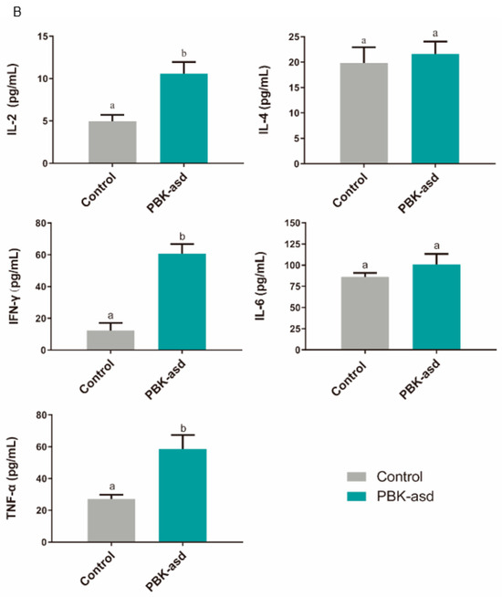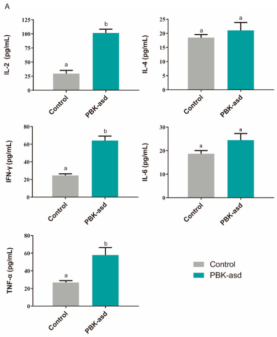 The mean ± SEM of serum cytokines in control group (n = 5) and PBK-asd-immunized (n = 5) buck (A) and kid (B) Yiling goats, respectively, detected at eight weeks. Different superscript letters represent a significant difference at p < 0.05.