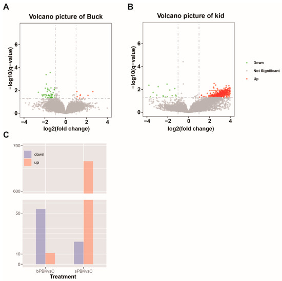 Gene expression profiles of immunocastrated testis. (A) Volcano plot showing differentially expressed genes between bulk immunization group and control group. (B) Volcano plot showing differentially expressed genes between kid immunization group and kid control group. Red and green dots represent up- and down-regulated genes, respectively while black dots represent the genes without significant differential expression. (C) Bar plot presentation number of DEGs between treatment groups: bPBK and sPBK represent buck and kid immunized groups, respectively.