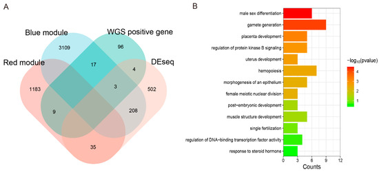 Integrated analysis of whole genomic and transcriptome datasets. (A) Venn diagram was made to intersect differential genes, red and blue module genes related to testis growth and development, and positive selection genes in WGS. Genes that overlapped with WGS were singled out. The number in each cell represents the number of genes that intersect. (B) GO enrichment of intersected genes from A in biological process.