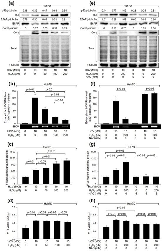 Next, we explored the mechanism through which H2O2 reduces HCV Core levels in a p53-dependent manner. As reported previously [43], HCV infection increased p53 levels in Huh7D cells (Figure 1a). H2O2 treatment resulted in an additional dose-dependent increase in p53 levels in Huh7D cells. Moreover, the ectopic expression of HCV Core in HepG2 cells increased p53 levels (Figure 2a), as previously reported [43], and this effect was further enhanced by H2O2 treatment in a dose-dependent manner (Figure 2a). Notably, neither HCV infection nor H2O2 treatment could increase p53 levels in Huh7D cells in the presence of NAC (Figure 1e), indicating that the transcriptional activity of p53 is essential for its upregulation by HCV Core expression and H2O2 treatment. As a result, the intracellular ROS levels consistently correlated with p53 levels in the presence of HCV Core in both HCV infection (Figure 1a,c) and HCV Core overexpression systems (Figure 2a,d). Under the same conditions, a negative correlation between HCV Core and p53 levels was observed (Figure 1a and Figure 2a), consistently with the established function of p53 as an inhibitor of HCV replication [27,28,29]. These findings suggest that H2O2 increases p53 levels to downregulate HCV Core levels in human hepatoma cells.
