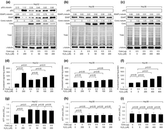 As shown in Figure 1a, H2O2 dose-dependently downregulated the levels of HCV Core, a crucial determinant of HCV replication [40], during HCV replication in Huh7D cells. To confirm that the downregulation of HCV Core levels is a cause and not a consequence of HCV inhibition by H2O2, we examined whether H2O2 could directly reduce HCV Core levels without the involvement of other HCV proteins. Consistent with a previous report [20], ectopic HCV Core expression increased intracellular ROS levels in HepG2 but not Hep3B cells (Figure 2d,e). Additionally, H2O2 treatment in the presence of HCV Core resulted in an additional dose-dependent elevation of ROS levels in HepG2, while the effect was not significant in Hep3B cells (Figure 2d,e). H2O2 induced a dose-dependent reduction in the levels of ectopically expressed HCV Core in HepG2 (Figure 2a) but not Hep3B cells (Figure 2b), indicating the critical function of p53 in the H2O2-mediated downregulation of HCV Core. In HepG2 cells, treatment with H2O2 led to a decrease in MTT values, whereas the ectopic expression of HCV Core increased MTT values (Figure 2g), as previously demonstrated [41]. However, the inhibitory effect of H2O2 on cell viability was not observed in HepG2 cells expressing HCV Core (Figure 2g). This is probably because HCV Core restrained H2O2 from upregulating p53 and intracellular ROS levels in these cells (Figure 2a,d). Neither the negative effect of H2O2 nor the positive effect of HCV Core on MTT activity was observed in Hep3B cells (Figure 2h). These findings indicate that the downregulation of HCV Core levels induced by H2O2 is a specific event in the presence of p53.