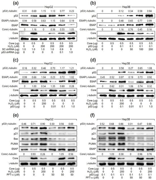 H2O2 downregulates HCV Core levels by elevating p53 levels in human hepatoma cells. (a–d) Cells were transiently transfected with the specified plasmids for 24 h and treated with H2O2 at the designated concentrations for an extra 24 h, analyzed by Western blotting. For (e,f), some cells were treated with H2O2 in the presence of pifithrin-α (PFT-α).