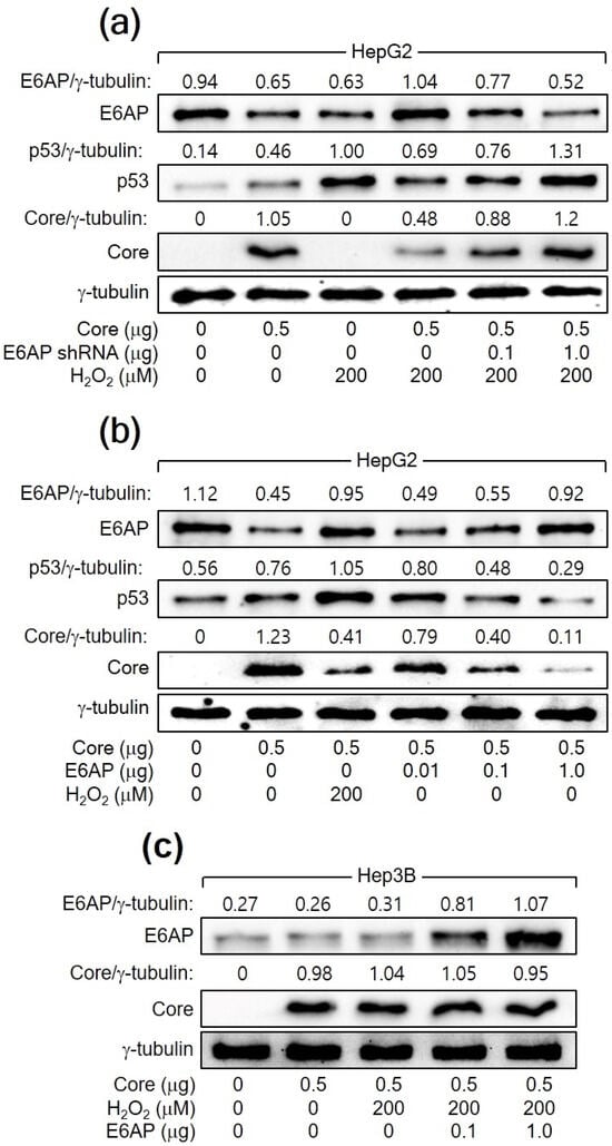 - Park, J.M.; Yoon, H.; Jeong, Y.; Jang, K.L. Tumour suppressor p53 inhibits hepatitis C virus replication by inducing E6AP-mediated proteasomal degradation of the viral core protein. FEBS Lett. 2022, 596, 2525–2537. [Google Scholar] [CrossRef]