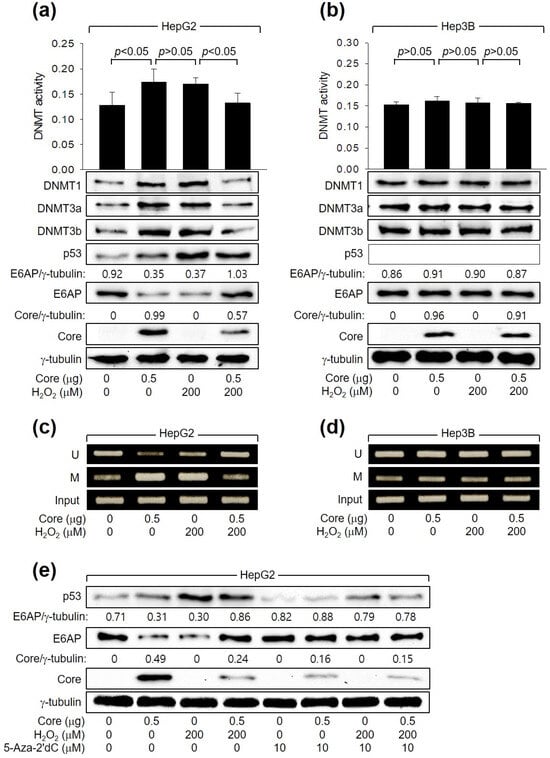 Next, we investigated how HCV Core and H2O2 individually or in combination regulate E6AP levels. In accordance with a prior report [26], HCV Core increased the levels of DNMT1, DNMT3a, and DNMT3b and their enzyme activity. This led to the promoter hypermethylation of the E6AP gene and subsequent downregulation of E6AP levels in HepG2 cells (Figure 5a,c). These effects were dependent on p53, as they were not observed in Hep3B cells (Figure 5b,d). Similarly, H2O2 induced the activation of DNMTs, leading to the inhibition of E6AP expression through promoter hypomethylation in HepG2 (Figure 5a,c) but not in Hep3B cells (Figure 5b,d, lane 3). Interestingly, when H2O2 was combined with HCV Core in HepG2 cells, it downregulated both the enzyme activities and protein levels of DNMT1, DNMT3a, and DNMT3b, leading to promoter hypomethylation of the E6AP gene. Consequently, this resulted in the upregulation of E6AP protein levels in HepG2 cells (Figure 5a,c). These effects were not observed in Hep3B cells (Figure 5b,d). The individual and combined effects of HCV Core and H2O2 on E6AP and HCV Core levels in HepG2 cells were almost completely nullified by treatment with a universal DNMT inhibitor, 5-Aza-2′dC (Figure 5e). Taken together, we conclude that H2O2 activates E6AP expression via promoter hypomethylation, which is dependent on both p53 and HCV Core.