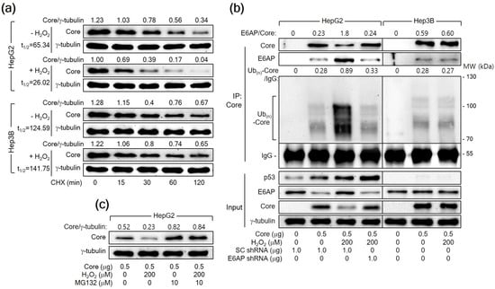 A previous report has demonstrated that E6AP as an E3 ligase induces ubiquitination and proteasomal degradation of HCV Core [25]. Therefore, we first determined whether H2O2 reduces the protein stability of HCV Core in human hepatoma cells. For this purpose, HepG2 cells expressing HCV Core were treated with CHX to inhibit additional protein synthesis and we measured the levels of both HCV Core and γ-tubulin in these cells. The half-life (t1/2) of HCV Core was 65.34 min, which was shortened to 26.02 min upon treatment with H2O2 in HepG2 cells (Figure 6a), suggesting that H2O2 decreases the protein stability of HCV Core in HepG2 cells. However, the t1/2 value of HCV Core in Hep3B cells was 124.59 min, showing minimal impact from H2O2 treatment (t1/2 = 141.75 min). These results suggest a p53-dependent mechanism by which H2O2 reduces the protein stability of HCV Core.