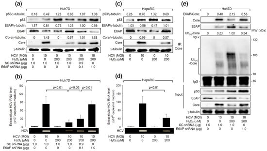 Consistent with the observations in the HCV Core overexpression system (Figure 2), HCV infection led to an increase in p53 levels but a decrease in E6AP levels, likely attributed to the influence of HCV Core, during HCV replication in both Huh7D and HepaRG cells (Figure 7a,c). Treatment with H2O2 resulted in an additional upregulation of both p53 and E6AP levels, consequently inhibiting HCV replication in both Huh7D and HepaRG cells, as evidenced by reduced levels of intracellular HCV Core (Figure 7a,c) and extracellular HCV particles (Figure 7b,d). Additionally, E6AP knockdown nearly nullified the capability of H2O2 to inhibit HCV replication in Huh7D cells, which was evidenced by an increase in intracellular HCV Core levels as well as extracellular HCV particles (Figure 7a,b). Treatment with H2O2 also enhanced the interaction between HCV Core and E6AP during HCV infection in Huh7D cells, leading to robust ubiquitination of HCV Core and the subsequent reduction in its protein levels (Figure 7C). These effects were almost nullified when E6AP was knocked down by a specific shRNA (Figure 7C, lane 4). Taken together, we conclude that H2O2 inhibits HCV replication in vitro by upregulating E6AP levels and promoting the Ub-dependent proteasomal degradation of HCV Core.