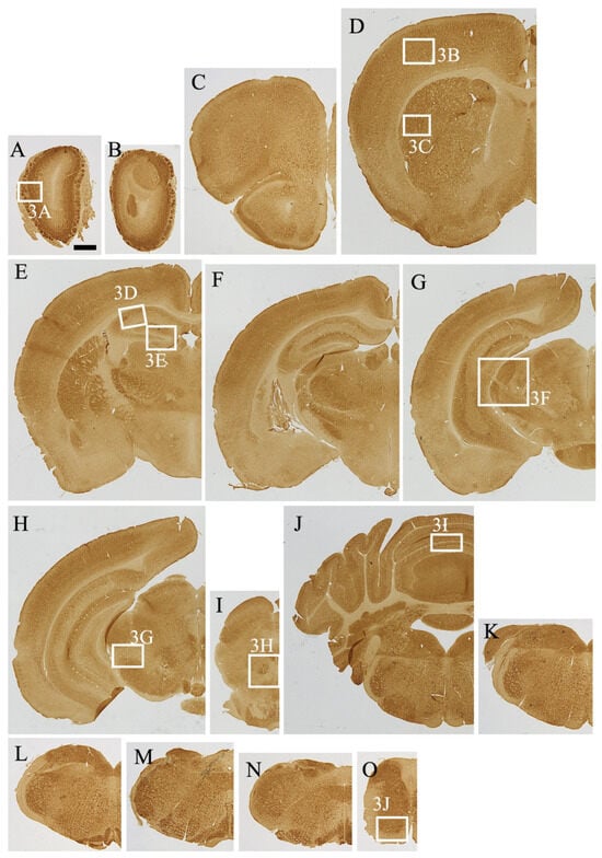The ABC-DAB reaction was utilized for the densitometric analysis of IR by means of ImageJ version 1.54, a software developed by the US National Institute of Health in Bethesda, MD. The density of the samples was evaluated on a scale of 5 distinct levels. The procedures involved in this process have been described in detail in prior publications [,]. The MEGF8 intensity threshold was set to twice the baseline value using ImageJ. A 5-point density scale was employed, with ++++ representing the highest density, +++ indicating higher density, ++ indicating high density, + indicating low density, and ~ indicating background density. Owing to methodological constraints, the density scale indicated the mean density of the cells and neuropil staining. Anatomical structures were identified by directly observing Nissl-stained sections, with the Paxinos and Franklin atlas serving as a guide [].