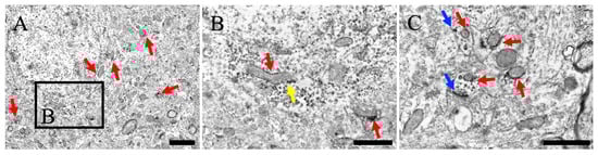 (A) Neurons and neuropils near the neuronal soma are present in layer V of the cerebral cortex. (B) Magnified view of (A). (C) The neuropil far from the neuronal soma. Red arrows indicate MEGF8 immunoreactivity near the mitochondria. Yellow arrows indicate MEGF8 immunoreactivity near subcellular organelles, without mitochondria. Blue arrows indicate MEGF8 immunoreactivity near the cell membrane, including the synapses. Scale bars: (A) = 2 μm; (B,C) = 1 μm.