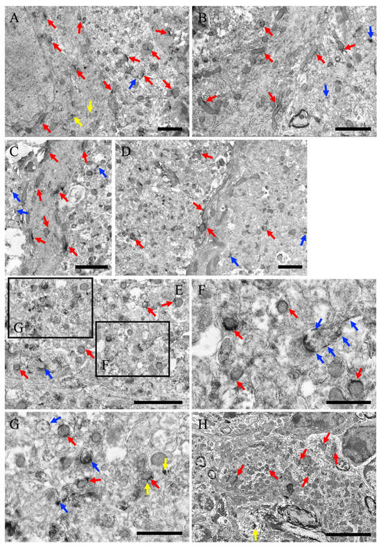 Immuno-electron microscopy of the cerebellum. (A) Purkinje cell somata and neuropils in the Purkinje cell layer. (B) Dendritic process (proximal portion) of Purkinje cells and the neuropil in the molecular layer. (C) Dendritic process (middle portion) of the Purkinje cells and the neuropil in the molecular layer. (D) Dendritic process (distal portion) of Purkinje cells and neuropils in the molecular layer. (E–G) The neuropil far from the neuronal soma. (F,G) Higher-magnification views of (E). (H) Granular somata and neuropils in the granular cell layer. Red arrows indicate MEGF8 immunoreactivity near the mitochondria. Yellow arrows indicate MEGF8 immunoreactivity near subcellular organelles, without mitochondria. Blue arrows indicate MEGF8 immunoreactivity near the cell membrane, including the synapses. Scale bars: (A–E) = 2 μm, (F,G) = 1 μm, and (H) = 5 μm.