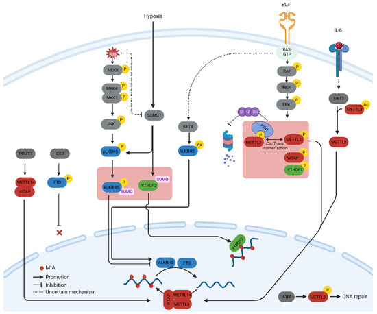 Ribonucleotides in RNA molecules undergo a diverse range of chemical modifications of nitrogenous bases and ribose sugars. The term “epitranscriptome” collectively refers to all the chemical modifications in RNA molecules. To date, more than 170 types of chemical modifications have been reported in RNAs, including messenger RNA (mRNA), ribosomal RNA (rRNA), transfer RNA (tRNA), long noncoding RNA (lncRNA), and small nucleolar RNA [1]. N6-methyladenosine (m6A) is the most common internal chemical modification of mRNA. The m6A modification is catalyzed by a nuclear methyltransferase complex comprising methyltransferase-like (METTL)3, METTL14, and Wilms’ tumor-associated protein (WTAP) [2]. Proteins with a YT521-B homology (YTH) domain, such as YTHDF1, F2, F3, C1, and C2, specifically recognize and bind to m6A nucleotides [3]. In contrast, RNA demethylases with an Alk domain, such as ALKBH5 and ALKBH9 (FTO), can remove methyl groups from m6A [3]. In this section, we provide a concise introduction to m6A-related proteins and a comprehensive overview of their regulatory mechanisms in cancer cells.