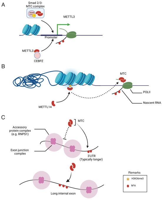 Despite a clear understanding of m6A methylation machinery, the mechanisms governing the specificity of m6A deposition remain elusive. m6A-IP-Seq experiments have revealed that m6A in human cells is predominantly enriched in the 3′-untreanslated (3′-UTR) region to regulate the translation efficiency and stability of mRNA [38]. In addition, m6A is highly enriched in mRNA containing long exons [8]. Furthermore, the m6A modification of specific mRNA is changeable depending on extracellular signals, nutrient availability, developmental stage, and response to chemotherapy in cancer cells [39]. The characteristic distribution pattern of m6A in the transcriptome raises questions about the mechanisms that regulate its specificity. To date, three potential mechanisms have been reported that underscore the roles of transcription factors, epigenetic modifications, and exon architecture in the pattern of m6A methylation, as summarized in Figure 2. These findings collectively indicate a close association between the transcriptional process and m6A modification. Specifically, transcription factors and co-activators have been identified as key players in recruiting the m6A methyltransferase complex to specific gene promoters, thereby promoting co-transcriptional m6A modification of the mRNA transcribed from the respective promoter. While the study of transcription factors has traditionally focused on their role in transcriptional regulation, the presented data highlight an additional role for these factors in post-transcriptional RNA processing. Consequently, their involvement in facilitating m6A modification suggests a broader impact on translation efficiency, expanding our understanding of the multifaceted functions of transcription factors beyond their well-established transcriptional regulatory roles. Moreover, epigenetic modifications, such as histone methylation, play a pivotal role as markers in recruiting the methyltransferase complex. Recent studies have highlighted the significant contribution of exon architecture in defining the distinctive pattern of m6A modification observed in mRNA. This exon-centric model precisely elucidates the reasons behind the enrichment of m6A modifications in the last exon or within long internal exons. However, our understanding of the upstream signaling pathways that influence the distribution of m6A marks across the transcriptome remains incomplete. The specific factors contributing to m6A specificity are detailed below, shedding light on the intricate network of regulatory elements that govern the precise localization of m6A modifications on RNA transcripts.